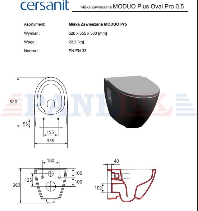 CERSANIT SET C929: MISKA ZAWIESZANA MODUO PLUS PRO OVAL CERSANIT VORTEX Z DESKĄ DUROPLASTOWĄ MODUO PLUS SLIM