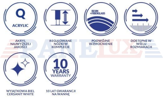 Wanna prostokątna FLAVIA 170 wyróżnia się wnętrzem o zaokrąglonym oparciu, które umożliwia wygodne ułożenie się podczas kąpieli. Szerokie krawędzie posłużą jako dogodne miejsce do przechowywania potrzebnych artykułów kąpielowych. Wanna posiada odpływ boczny, przy krótszym boku, oraz miejsce na montaż baterii. Sprzedawana jest w komplecie z regulowanymi nóżkami. Istnieje również możliwość dokupienia obudowy i parawanu.