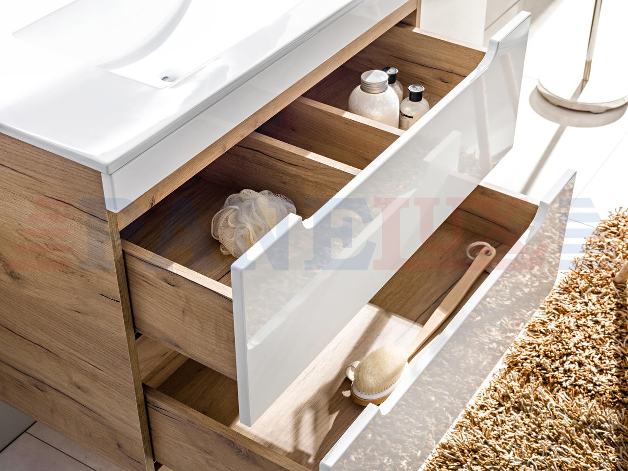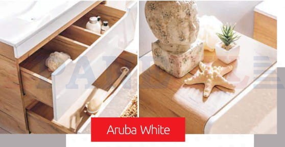 Aruba to niezwykła kolekcja, która zachwyca lekkim i nowoczesnym designem. Korpusy w kolorze drewna w połączeniu z białymi frontami tworzą delikatną całość w klimacie tropikalnego SPA. Zaokrąglone kanty wszystkich szafek dodają kolekcji niebanalnego charakteru i lekkości, a fronty bez uchwytów nawiązują do najnowszych trendów wnętrzarskich. Kolekcja składa się z niskich i wysokich szafek w różnych wariantach, co pozwala na skomponowanie indywidualnego i niepowtarzalnego zestawu. Niewątpliwie ciekawym i niezwykle modnym rozwiązaniem jest szafka pod umywalkę nakładaną. Doskonałym dopełnieniem serii jest lustro z podświetleniem LED, które nadaje całej serii nowoczesnego charakteru. Kolekcja Aruba przypadnie do gustu wszystkim, którzy szukają niebanalnych i nowoczesnych rozwiązań do swojej łazienki.