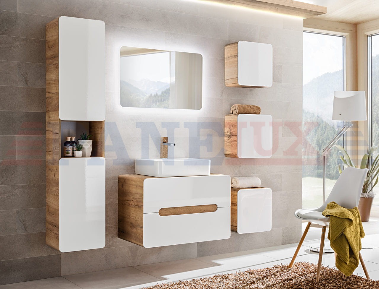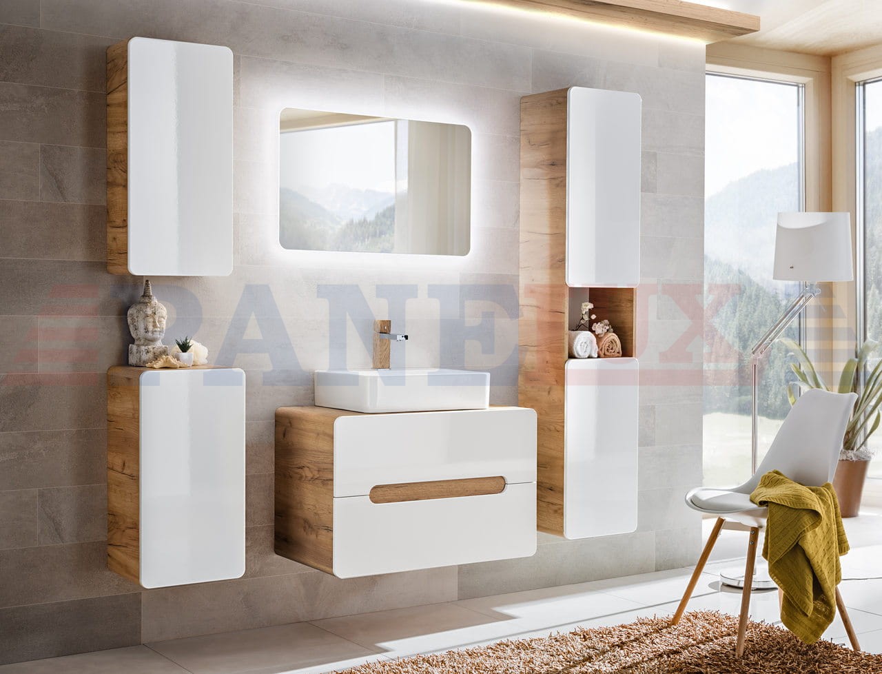 Aruba to niezwykła kolekcja, która zachwyca lekkim i nowoczesnym designem. Korpusy w kolorze drewna w połączeniu z białymi frontami tworzą delikatną całość w klimacie tropikalnego SPA. Zaokrąglone kanty wszystkich szafek dodają kolekcji niebanalnego charakteru i lekkości, a fronty bez uchwytów nawiązują do najnowszych trendów wnętrzarskich. Kolekcja składa się z niskich i wysokich szafek w różnych wariantach, co pozwala na skomponowanie indywidualnego i niepowtarzalnego zestawu. Niewątpliwie ciekawym i niezwykle modnym rozwiązaniem jest szafka pod umywalkę nakładaną. Doskonałym dopełnieniem serii jest lustro z podświetleniem LED, które nadaje całej serii nowoczesnego charakteru. Kolekcja Aruba przypadnie do gustu wszystkim, którzy szukają niebanalnych i nowoczesnych rozwiązań do swojej łazienki.