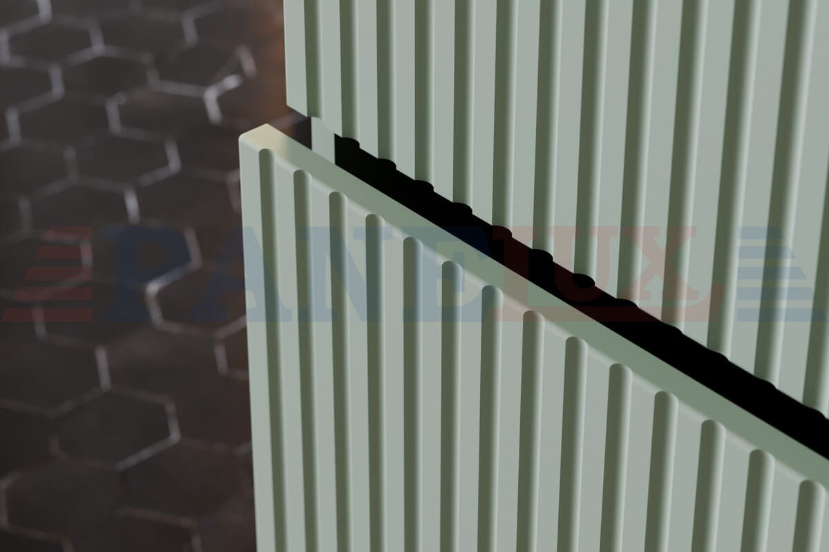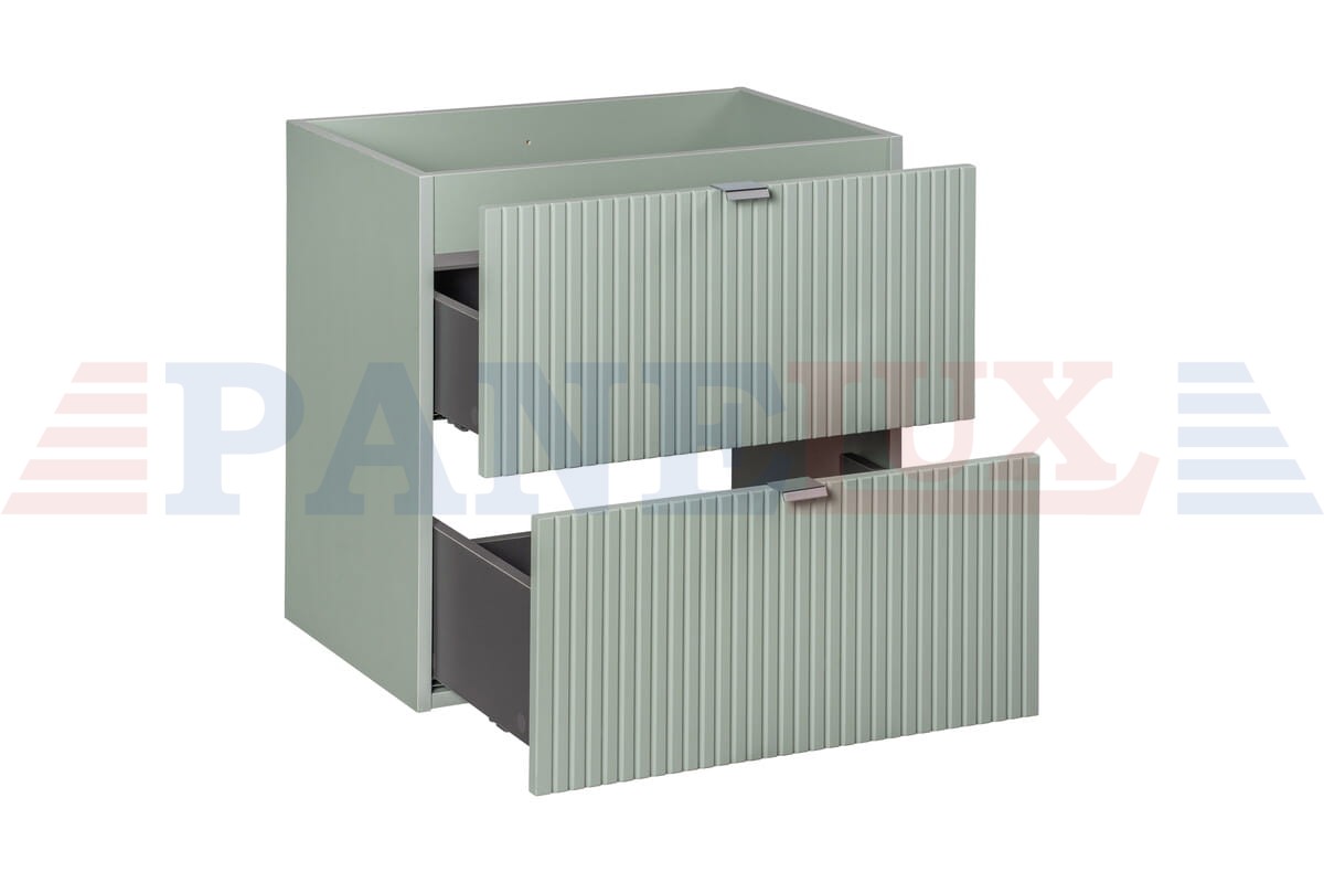 Fronty mebli zostały ozdobione frezowanymi ryflami pionowymi, dodając im elegancji i charakteru. Uchwyty w kolorze srebrnym doskonale komponują się z kolorem zestawu Reed Green. Dodatkowo, w zestawie znajduje się także blat oraz umywalka nablatowa Beyond 5 White, która podkreśla nowoczesny charakter całej kompozycji.