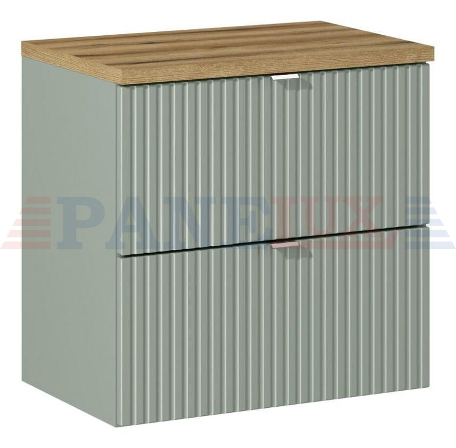 Zestaw składa się z dwóch elementów: szafki pod umywalkę o wymiarach 82-60-2S oraz blatu NOVA OAK A 89-60. Fronty zostały wykonane z frezowanych ryfli pionowych, co nadaje meblom eleganckiego charakteru. Uchwyty w kolorze srebrnym dodają im nowoczesności i sprawiają, że są łatwe w użytkowaniu.