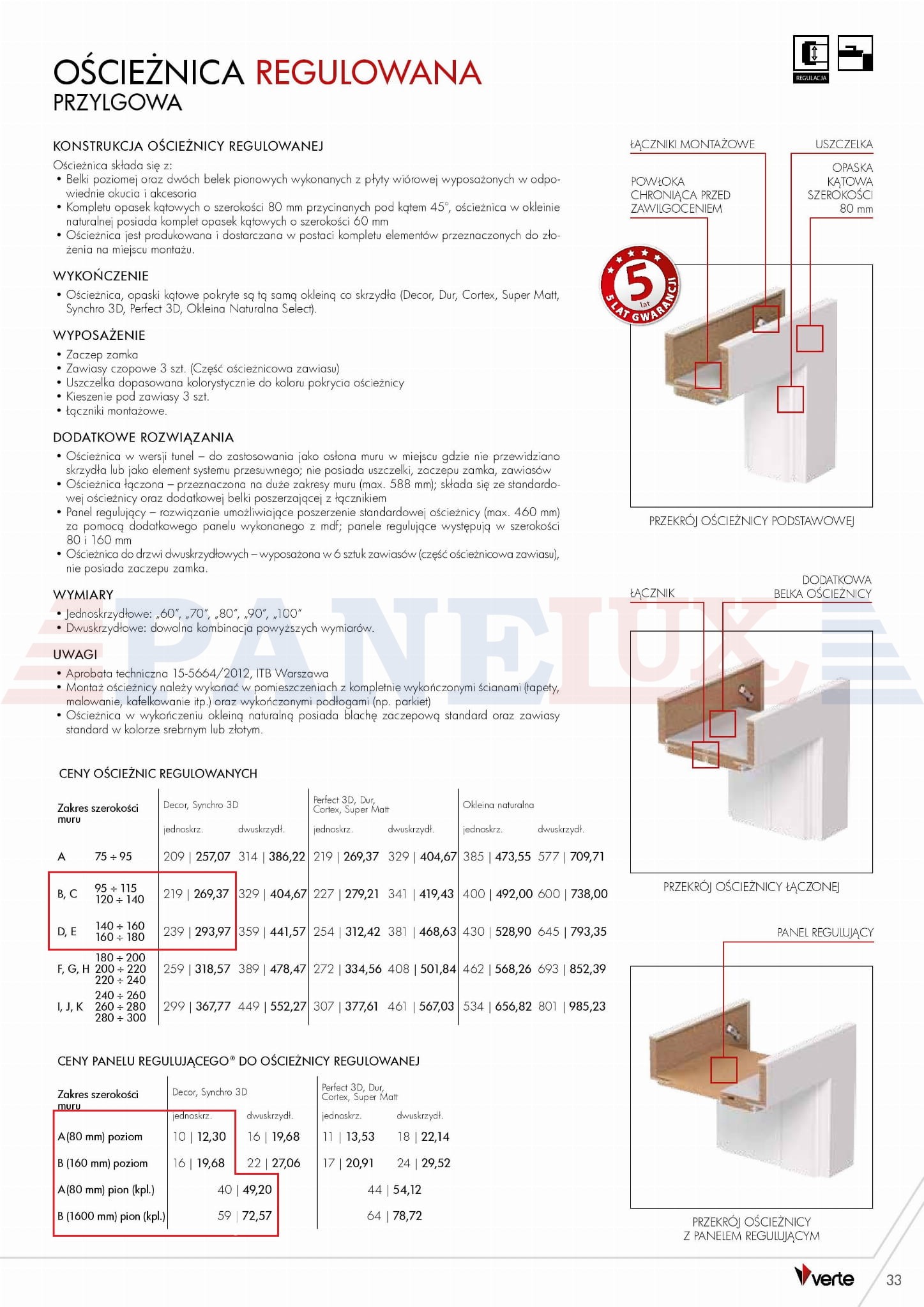 Stosując ościeżnice oznaczone czerwona ramką i dokładając panel regulujący można uzyskać ościeżnicę aż do rozmiaru 340mm grubości muru (np. ościeżnica Verte B 95x115 + panel regulujący A 80mm uzyskujemy ościeżnicę o zakresie 175x195)