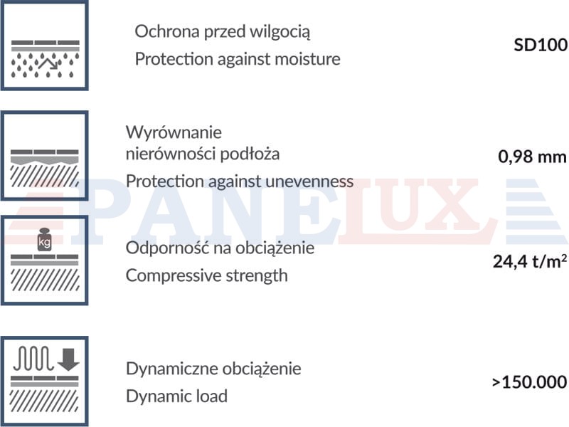 Właściwości: Izolacja akustyczna, wyciszenie odgłosu kroków, wysoka zdolność pochłaniania dźwięków. Wolny od plastyfikatorów, azbestu, formaldehydu, chlorowców i metali ciężkich. Spełnia wytyczne francuskiego AFSSET A+ dot. wymogów VOC (lotne związki organiczne) posiada oznaczenie BLUE ANGEL.