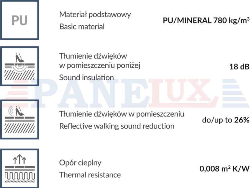 MULTIPRO 1.8 jest podkładem o wysokiej gęstości wytworzonym z naturalnych materiałów w 93% oraz ze spoiw poliuretanu, stanowiących warstwę paroizolacji.