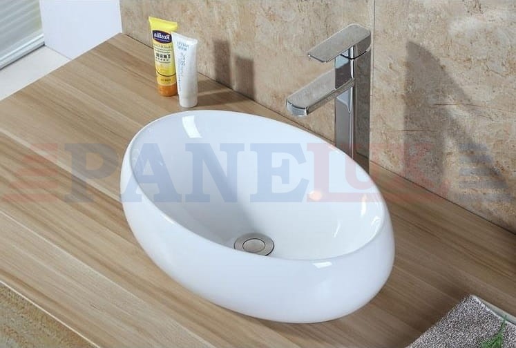 Śnieżnobiała umywalka ceramiczna blatowa, o oryginalnym i niepowtarzalnym wyglądzie oraz niespotykanym, owalnym kształcie.